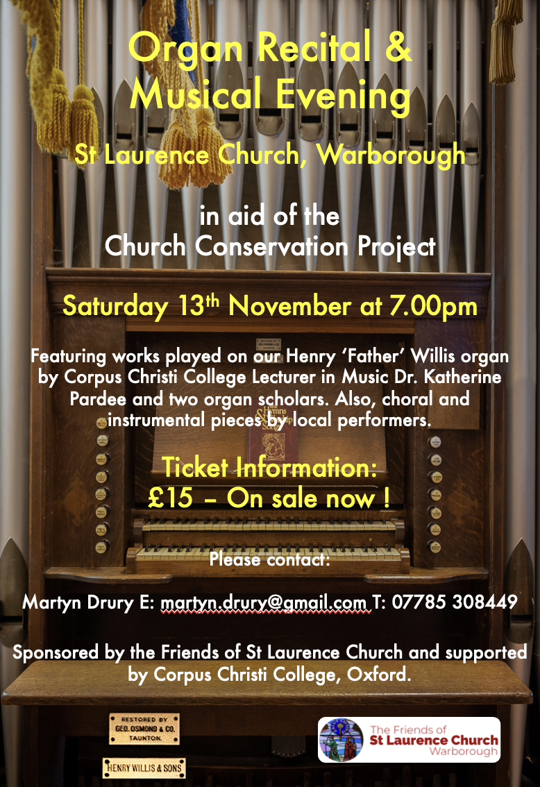 Saturday evening, 13th November, St :Laurence Church, Warborough: One hundred and twenty guesses were treated to an evening of music for organ, violin and voice featuring our wonderful Henry “Father” Willis organ. Katie Pardee, lecturer in music at Corpus Christi College, Oxford, lead the evening supported by two of her organ scholars, Brendon Qi (senior scholar) and Ali Trowell (junior scholar), with Rachael Pedley on violin and mezzo soprano, Charlie Tetley entertained the audience with pieces from Handel, Boëllmann, Elert, Vivaldi, Mozart, Bach and others. The air was a-buzz as guests assembled for drinks in the Church Hall afterwards and all agreed it had been an evening to remember. Thanks to the generosity of guests, sponsors and advertisers, we raised £3500 towards the Friend’s church conservation fund. Martyn Drury, Chair of the Friends of St Laurence said: “The church is a community asset, available for all sorts of uses, and after tonight’s success we hope to hold similar evenings of entertainment again in the near future.”